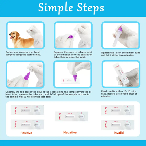दसोफॅबिओ सीडीव्ही एजी टेस्ट किटप्रदान करण्यासाठी डिझाइन केलेले आहे10-15 मिनिटांत गुणात्मक परिणाम, मध्ये अँटीजेन्स शोधणेडोळा आणि अनुनासिक स्रावडबल-अँटीबॉडी सँडविच इम्युनोक्रोमॅटोग्राफिक पद्धत वापरणे. स्पष्ट सहसी-लाइन आणि टी-लाइननिकाल निर्देशक, हे किट आत्मविश्वास आणि गतीसह फ्रंटलाइन पशुवैद्यकीय व्यावसायिकांना समर्थन देते.